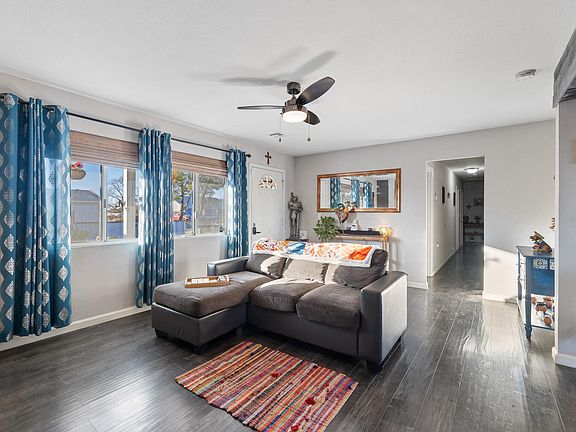 Inside, you'll find a home that exudes modern elegance. The kitchen is a chef's dream, featuring stainless steel appliances, granite countertops, and a striking mosaic backsplash that perfectly complements the cabinetry. The bathrooms are equally impressive, boasting modern vanities with bowl sinks and granite finishes. Throughout the home, gray laminate flooring and a neutral color palette create a cohesive and sophisticated ambiance.