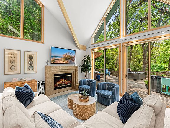 The moment you step through the front door, you're greeted by a bright, open-concept interior that's perfect for gathering with loved ones. The spacious living room features soaring ceilings and expansive windows, flooding the space with natural light and offering picturesque views of the surrounding woods. Sink into the plush sofas by the fireplace, where cozy evenings await with a movie on the large flat-screen TV. Adjacent to the living area, the dining space and fully equipped kitchen make entertaining effortless, with seating for everyone and everything you need to whip up your favorite meals.