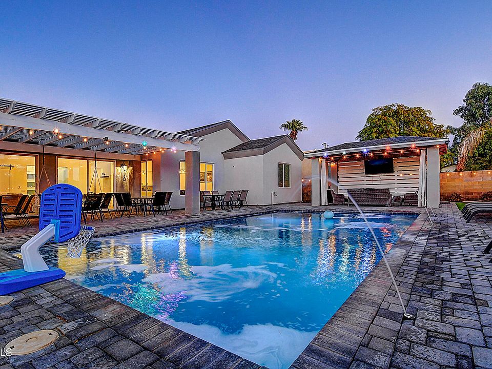 Currently a successful AIRBNB with high ratings. This remarkable 8-bedroom masterpiece is truly a dream come true. Featuring a 3-car garage, paver driveway, tennis/basketball court, & a private courtyard w/an exterior fireplace that enhances its curb appeal. Meticulously designed interior w/clean lines promotes a modern feel & sophistication. At the heart of the home, the impressive open floor plan is bathed in natural light, creating an inviting space for everyday living. Beautiful kitchen offers abundant cabinetry recessed & pendant lighting, tile backsplash, SS appliances, quartz counters, & a waterfall island w/a breakfast bar. Grand owner's retreat boasts plush carpet, an elegant ensuite w/dual sinks, a garden tub, & a walk-in closet. This house includes a 2nd main bedroom w/its own bathroom & walk-in closet. Stunning backyard provides a lovely pergola, gazebo, putting green, and sparkling swimming pool. Experience the luxurious lifestyle you deserve!