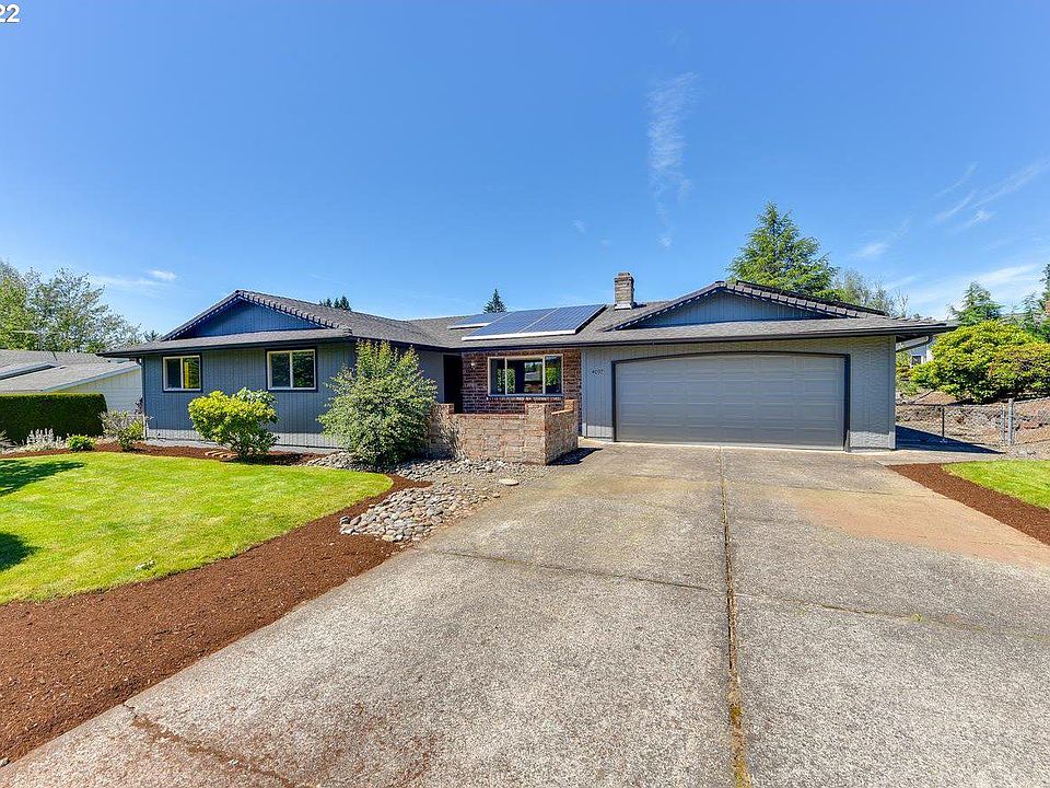 Spacious One Level Ranch With Remodeled & Open Kitchen Featuring a large quartz counter island,cabinets galore,laminate flooring, newer windows,brick wood burning fireplace,3 good sized bedrooms,2.1 bathrooms,utility room off the family room,freshly painted outside,over 9,000 sqft large corner lot,with possible RV parking, patio & garden shed,solar panels,fenced and ready to move in,convenient location minutes to shopping, restaurants, Fresh Coffee & Fruit Stands!