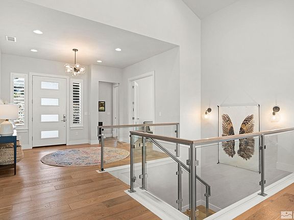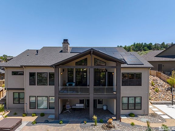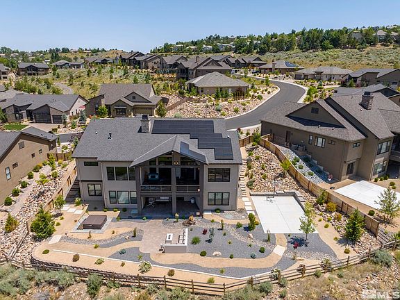 Exquisite Luxury with Breathtaking Views in Reno’s Prestigious Pine Bluff, Caughlin Ranch community. Uncover the epitome of refined elegance in this semi-custom home, crafted by HomeCrafters in 2018, offering a flawless blend of style, comfort, and modern convenience. Situated in the highly-desirable Pine Bluff community of Caughlin Ranch, this 5-bedroom, 6-bathroom estate boasts a remarkable 180-degree panorama of the Sierra Nevada Mountains and Peavine Peak,, creating a serene backdrop for daily living and entertaining alike. The home's thoughtful main level floor plan showcases expansive living, dining, and kitchen areas. The gourmet kitchen impresses with custom cabinetry, built-in Sub Zero refrigerators, top-of-the-line Miele appliances, including an espresso maker and steam oven, and two dishwashers. An open layout leads to a balcony with built-in speakers, perfect for relishing the impressive views. Each bedroom provides luxurious privacy with its own en suite bathroom. The main floor hosts the primary, guest, and office rooms, while the home’s design lends itself to multi-generational living. On the basement level, find a second family room, a gym, and a handy kitchenette. Walkout access to the professionally landscaped yard reveals a built-in BBQ, a fire pit, a spa, and a basketball court. The yard's low-maintenance, drought-tolerant landscaping ensures you enjoy more leisure time. The residence is upgraded with smart home features such as Lutron switches and Cat 6 wiring throughout, complementing the modern lifestyle. Energy efficiency is optimized with Low-E windows and doors and a 28-panel Tesla solar system, coupled with three Powerwalls, enabling the home to operate off-grid for days. With wood flooring throughout, two conveniently placed laundry rooms, generous storage spaces, and a three-car garage, this home offers an unmatched level of comfort. The adjacent Cross Peak and Caughlin Ranch trails invite you to embrace the outdoors. In this exceptional Pine Bluff estate, experience a remarkable balance of elegance, comfort, and modern functionality - a place where every detail creates a beautiful harmony, and every room offers a breathtaking view