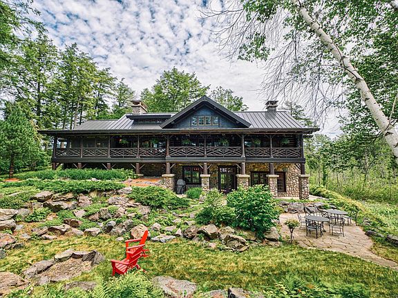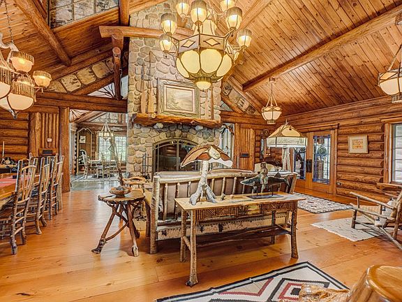 Adirondack-style log estate on a private peninsula with nearly 2,300 ft of frontage on 200-acre Buffalo Lake, a quiet lake in NW Wisconsin surrounded by the Chequamegon Forest. Inspired by the historic Great Camps, this 3-4BR/3.5BA retreat blends rustic elegance with exceptional craftsmanship-hand-peeled logs, birch bark accents, and custom natural finishes throughout. Designed with a dramatic great room, en-suite bedrooms, lakeside screen porch, and panoramic views that bring the outdoors in. The 16-acre lot offers sunset views, rare privacy, and a gentle slope to sandy, swimmable frontage. Wander the perennial landscape and unwind at the gazebo on the point. Oversized 2-car garage includes finished bonus space and bath-ideal for studio, office, or hobby use. A two-level shed offers generous storage for gear, toys, or workshop needs. A distinctive legacy property blending timeless design and understated luxury in a truly serene Northwoods setting.
