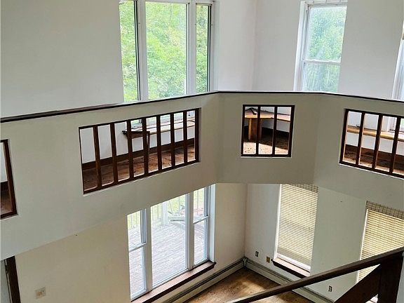 Tucked away in a peaceful wooded setting, this two-story home sits on 2 private acres and offers endless potential for someone ready to make it their own. Inside, you’ll find warm natural wood accents, hardwood flooring, and a stunning floor-to-ceiling fireplace that extends through both levels—creating a true centerpiece for the home. The main level features an eat-in kitchen with ceramic tile floors, a laundry room with extra storage, a full bath, and a versatile office or possible third bedroom. Oversized windows flood the home with natural light and showcase the serene, wooded surroundings. Upstairs, you’ll find two bedrooms, another full bathroom, and a cozy loft overlooking the main living area. Step outside to enjoy the expansive wrap-around deck—perfect for relaxing or entertaining while surrounded by nature. With its private setting and abundant character, this home is ready for your personal touch to bring it back to life.