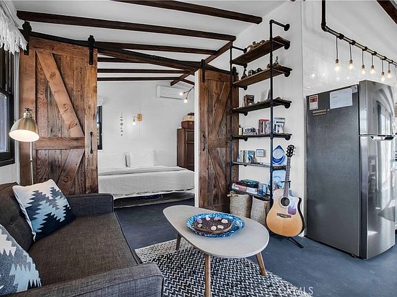 Inside, the one-bedroom, one-bath home features custom details throughout: hand-built raw edge shelving, sliding barn doors, designer lighting, and a freestanding mid-century wood-burning fireplace that anchors the open living area. The kitchen is both stylish and functional, with quartz countertops, floating shelves, and seamless flow into the main living space.