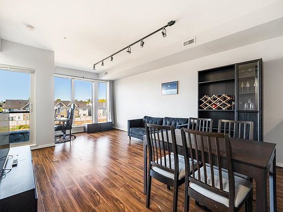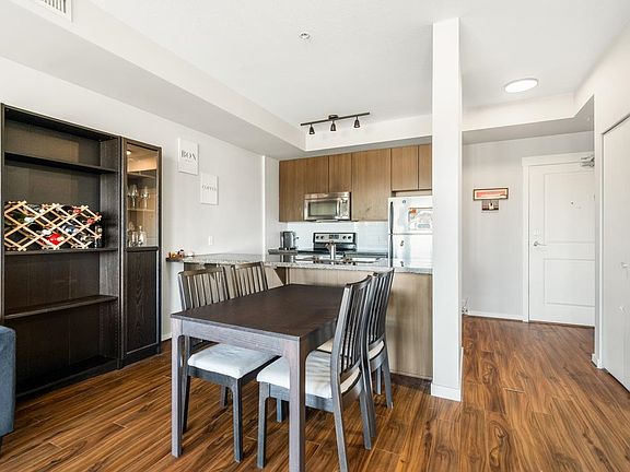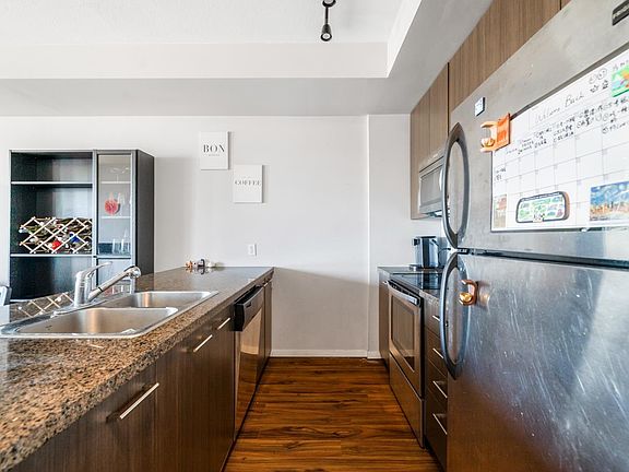 Beautiful 2-bedroom, 1-bathroom west-facing unit at Remy, featuring elegant interiors by Jane McCutcheon Designs. This home offers 9-foot ceilings, high-quality laminate flooring, and textured loop carpet in the bedrooms. The gourmet kitchen boasts granite countertops, stainless steel appliances, mosaic tile backsplash, and sleek faux wood-grain cabinetry. Enjoy a spa-like bathroom with soaker tub, full-height ceramic tile surround, and matching vanity. Located in a central area, just steps to Walmart, restaurants, and shopping plazas, with geo-thermal heating and cooling included for year-round comfort.
