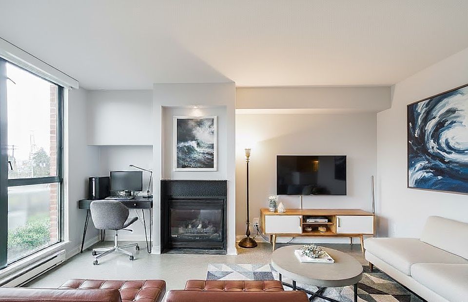 Private balconyGas cooktopBuilt-in fireplaceUpdated kitchenLarge windowsIn-suite laundry