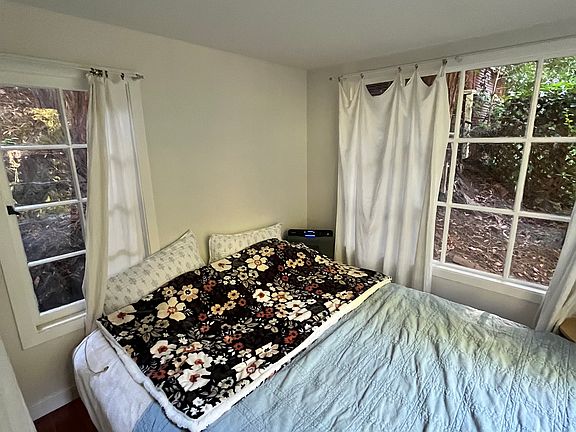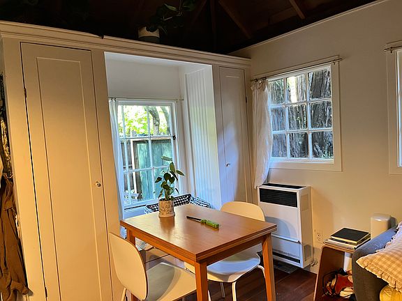 This is a furnished, private, and cozy cottage studio with redwood views, vaulted ceiling, bathroom with clawfoot tub, efficiency kitchen with gas range, small refrigerator, sitting area, dining/work table, window seat, bedroom with garden views, private patio, and a private entrance. It is best suited for one person. Includes a dedicated workspace.