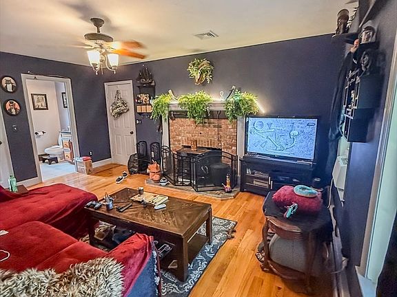 Brick wood burning fireplaceComposite deckGleaming hardwood floors