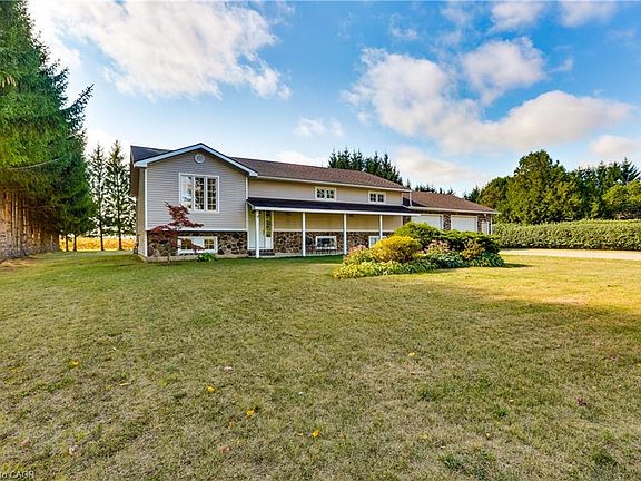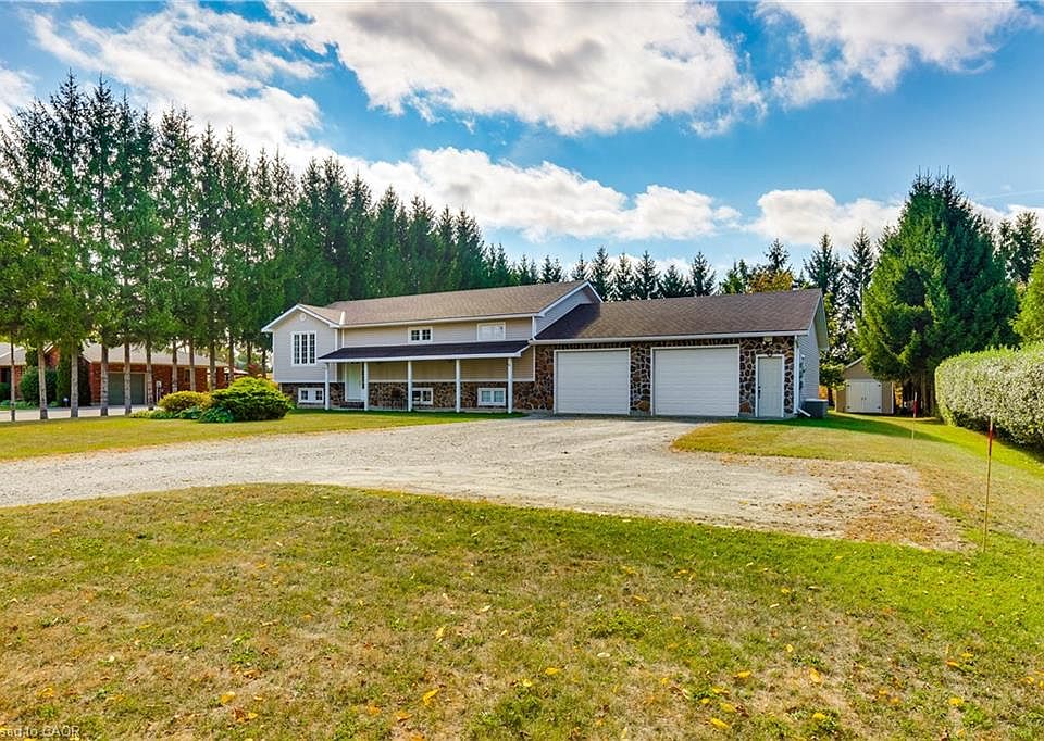 Welcome to this custom-built residence featuring nearly 2,600 sq. ft. of versatile living space, perfectly set on a landscaped 0.87-acre lot. Built in 2000, this 3+1 bedroom, 2.5 bathroom home (with potential for a 5th bedroom) blends quality craftsmanship with thoughtful design, creating an ideal setting for family life, entertaining, and everyday comfort. Showcasing a timeless fieldstone exterior and set behind a crush-and-run curved driveway, the home offers impressive curb appeal from the moment you arrive. Step inside to find a bright, inviting layout. The main level features a hardwood-floored living room, an eat-in kitchen with solid oak cabinetry, a built-in pantry cabinet, breakfast bar, and dining area. From here, step out to a walkout balcony overlooking the expansive backyard—ideal for enjoying morning coffee or evening sunsets. The lower level offers incredible flexibility, with a large recreation room warmed by a natural gas fireplace, an office, plus a full bedroom with a wall-to-wall closet and extra storage. A substantial utility room provides direct access to the oversized attached garage, making organization and functionality a breeze. The garage itself is a standout—measuring 28’ x 32’ with two 10’ x 8’ doors, heated by a wood stove (WETT-certified), and hardwired for door openers. For added convenience, a fully insulated and wired 11’ x 24’ rear shed with a 220-volt outlet and 40-amp pony panel offers space for hobbies, projects, or storage. Outdoors, the property truly shines. The landscaped yard offers plenty of room for a pool, gardens, or simply space to relax and entertain—all while enjoying the privacy and charm of the large lot. Located near the local public school and just minutes to Highways 24 and 403, this home provides small-town warmth with commuter-friendly convenience—making it a complete package. With its timeless design, flexible floor plan, and unbeatable lot, this home is built to last—and ready to welcome its next chapter.