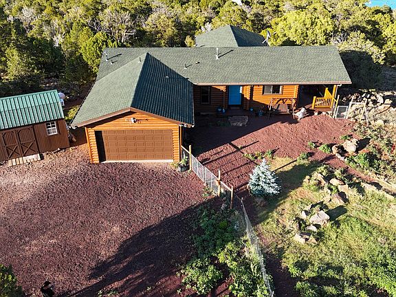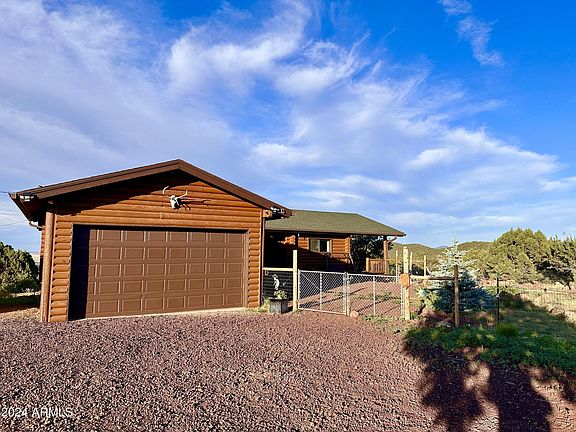 Views are incredible from this single level real log home sitting on 3.31 acres of land with AMAZING VIEWS is just East of Show Low. This 2 bedroom, 2 bath 1,548 sq. ft home has a great floor plan with a functional kitchen, with breakfast bar, dining room, there is a wall of windows in the family room to take advantage of the views as well as a deck off of each bedroom that you can sit out and enjoy the views as well. The side deck has plenty of room to BBQ. 2 car attached garage plus a separate shed with electric and another for yard tools. Also, the sellers also have made a '8x24'x9' high for chickens or rabbits etc. with a 19 x 24 fenced area. Five shade trees and 11 fruit trees were added in 2023. Fruit trees include plum, pear, peach and multiple varieties of cherries and apples. There is a also a fire pit surrounded by flowerbeds full of native sunflowers and other wildflowers that bring in a variety of bird species, and two large raised garden beds perfect for a hobby gardener. This one will not last long, come see this affordable log home with amazing views!