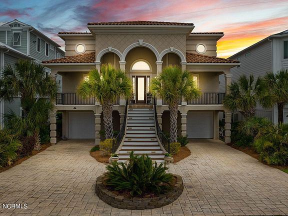 Majestic steps lead to this unique grand custom built Mediterranean style home perfectly situated in the sought-after ICW front area of Craven Street in Ocean Isle Beach, North Carolina. Immaculate landscaping, clear blue heated swimming pool with waterfall hot tub and pier to the ICW offers outdoor living at it's best. What exceeds expectations are the opulent finishes and details including an elegant chandelier, sweeping staircase, exquisite tile floors, stately columns, splendid mahogany built ins and expansive amount of windows.