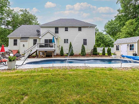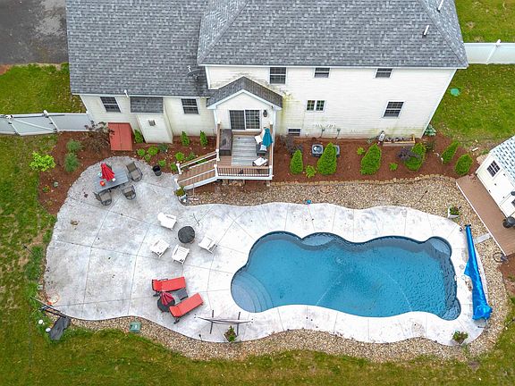 This stunning 10-year-old Colonial-style home sits at the end of a cul-de-sac on 3.86 acres, offering a serene country setting. With over 4,000 square feet of finished living space, this four-bedroom gem has it all. The heated inground pool is perfect for summer fun and relaxation, extending your swim season from early spring to fall. The spacious, modern kitchen features an open concept design that flows into the living room, making it ideal for entertaining. The cozy family room invites you to enjoy cooler evenings by the gas fireplace. Additionally, there is a large recreation area in the lower level that provides plenty of space for games and activities. With central air conditioning, you can stay cool during the warm months. The beautiful flooring includes stained and refinished solid oak floors and upgraded carpeting. Extra features of this home include an exterior shed and a fenced backyard for added convenience and privacy. This home offers a perfect blend of luxury and comfort. Don't miss out on this exceptional property!