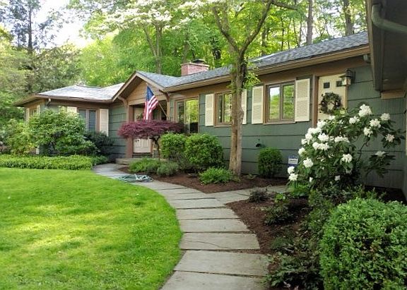 A sprawling ranch on over 1/2 an acre of beautifully landscaped green space. This mid-century modern marvel has so much to enjoy. 4 bedrooms with a recently renovated master, including a new master bath with soaking tub, separate shower and so much space! Another full bath has a connecting door to the third bedroom creating an opportunity for a second master or guest-suite. All four bedrooms are spacious with large closets and rest through the doors and down the hall, away from the main house. The main house offers handsome hardwood floors, loads of windows that welcome the natural light and beauty of the landscape and open space connectivity. Step into the family room/den with a wall of windows, wood burning fireplace and beautiful built-in, then linger in the formal living room with another fireplace, long window-seat and windows front to back. Next stop, the ADK room...one step inside and you are mentally on vacation enjoying all the signs and sounds of the cabin. Don't miss the formal dining room on your way to the kitchen. The dining room also has sliding door access to the back patios and a lovely view. There is space for friends and family to gather in the kitchen while you make the coffee or fix up lunch. There is another 1/2 bath and first floor laundry off the kitchen. Step outside from one of the sliders and you will enjoy gorgeous gardens, natural views and if you follow the path in the back...there is even a private basketball court waiting for you! Let's talk about updates. 2016 HVAC, 2017 Master bed/bath, 2018 roof, 2023 chimney, 2025 hot water tank, septic was pumped and inspected 2025.