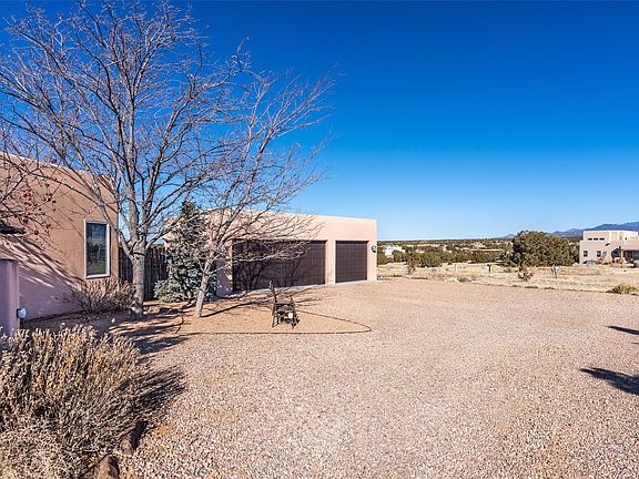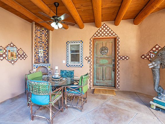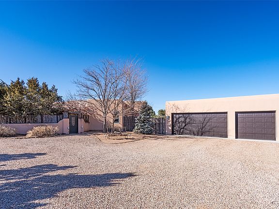 Lovely Eldorado home on 1.61 acres with views! Walled in entry courtyard with a Koi pond plus several outdoor portals with a green belt bordering the property in the back area. 3 bedrooms, 2 1/2 baths with an attached artist studio with a sink and upgraded 220 electric. There is a heated office area off the laundry room which is next to the heated studio. Three Kiva fireplaces and many colorful Santa Fe touches with an Asian twist! Vigas, Latilla ceilings, nichos, built-in bancos, vivid tile murals and 17" x 17" ceramic tile flooring throughout most of the home. New Weil McClain boiler installed in February 2025. Kitchen features stainless appliances with a newer Wolf induction cooktop, new LG refrigerator, Asko dishwasher, and new heavy duty Speed Queen washer/dryer. The kitchen cabinets have animated, hand painted tin motif panels. One step down to the Living area plus there is a den right by the kitchen. A bookshelf features a secret door that goes from the den to the entryway. Four mini-splits installed about 4 years ago. Roof redone by Santa Fe Roofing and Stucco; transferrable warranty until 11/2034. A heated walk way to the detached 3 car garage (874 square feet) was added in 2018 with built in California Closets cabinets. The garage also has epoxy painted floors and 2 skylights for natural light; with one skylight that can manually open. Mature landscaping with inground irrigation plus many apple, cherry and pear trees. Don't miss this delightful property; a peaceful oasis with plenty of Southwest charm.
