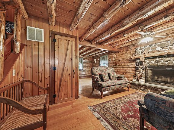 Cozy fireplaceSoaring ceilingsRustic charmTranquil dead-end roadMassive two-car garageExposed log beamsSpacious bedrooms