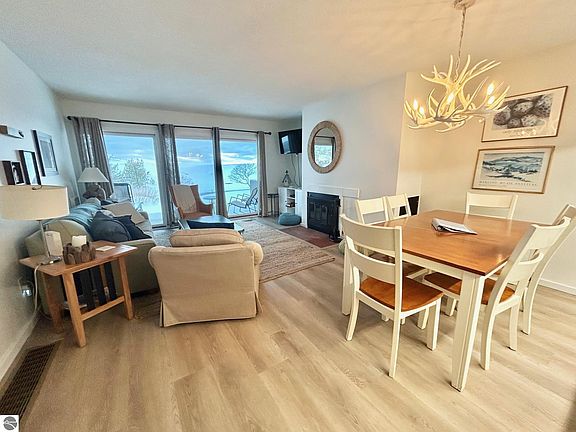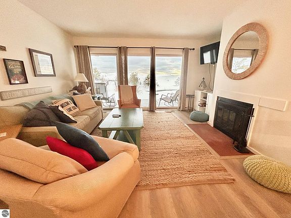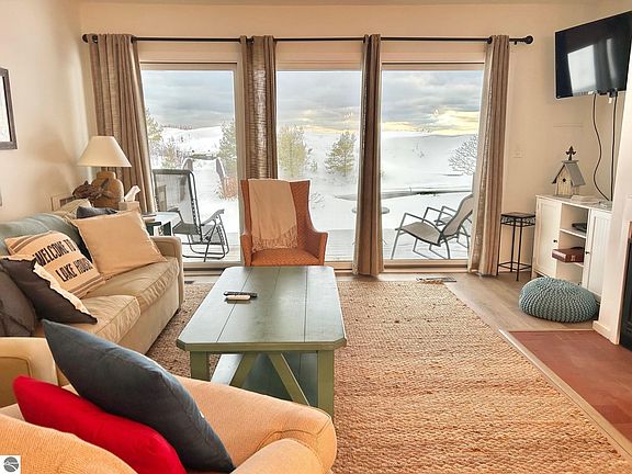 Whole ownership. Walk right out to the Crystal River from this two bedroom, two bathroom, waterfront, end unit condo, ideal for kayaking, tubing, wading, or splashing around. Just over the footbridge is also Lake Michigan, perfect for summer afternoons at the beach, or taking in a gorgeous, west facing sunset. Air conditioning has been installed, and there's a coin operated washer/dryer that's located in the lower level of the condo building. This space comfortably accommodates up to 6 people and would be a great retreat for enjoying northern Michigan and the Sleeping Bear Dunes National Lakeshore! Excellent rental history if renting is your intention. Sold furnished with some exceptions.