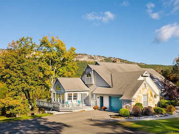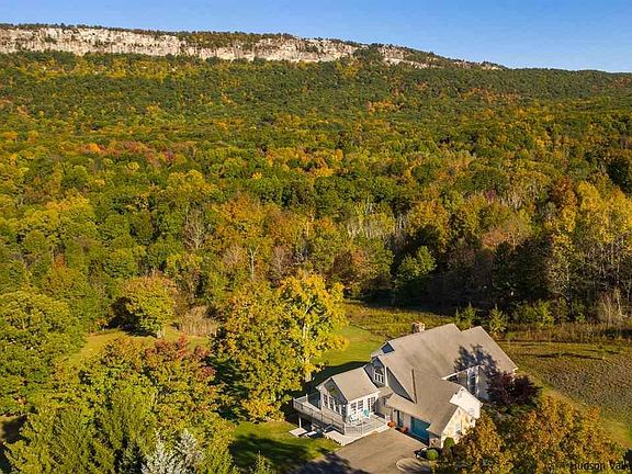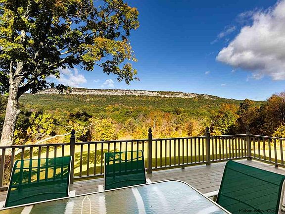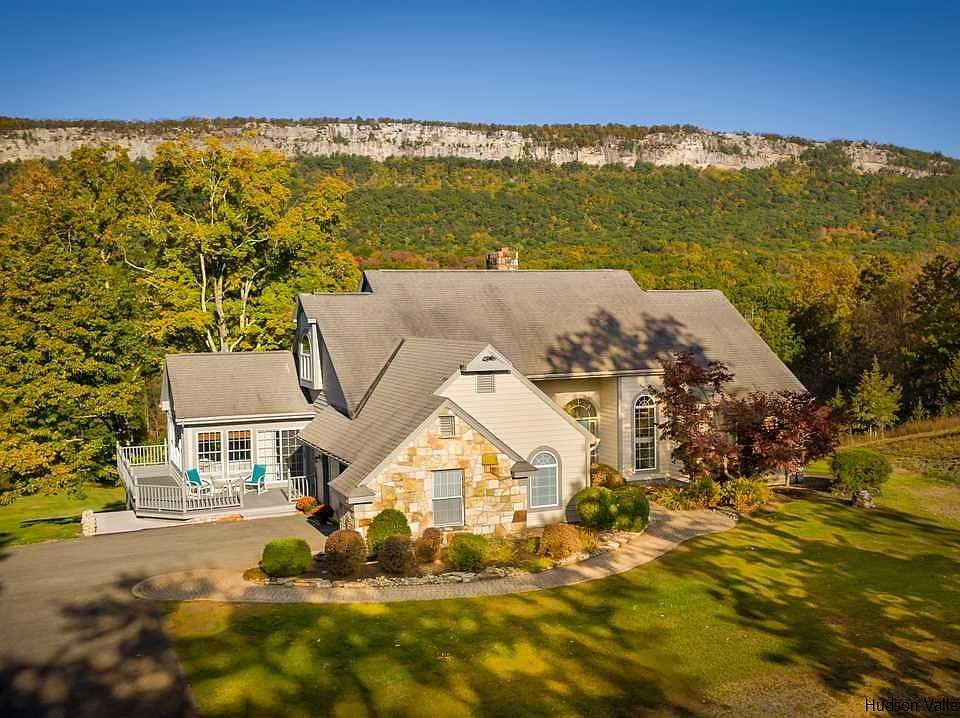 Wake up to the sun illuminating dramatic views of the majestic Shawangunk Ridge, visible from almost every room in this spacious and impeccably maintained contemporary home that's located just outside the village of New Paltz and moments from the Mohonk Preserve and Minnewaska State Park. The home rambles, offering plenty of space for a family or a large group to get away from it all, with four generously proportioned bedrooms, 3 ½ bathrooms, dramatic double-height living room with a soaring stone fireplace and a tall wall of windows facing the view, and a huge finished basement with direct access to the sweeping rear lawn, which faces the view. One of the most intimate and special spots in the house is the sunroom, which is just off the well-appointed eat-in kitchen. One of the second-floor bedrooms has been outfitted as a home-office, a wonderful amenity in the age of remote working. There's no better place to unwind and relax at any time of day, and to watch the light and the colors of the ridge change while a variety of birds soar overhead, than the sweeping rear deck, which wraps around the west and south sides of the home.