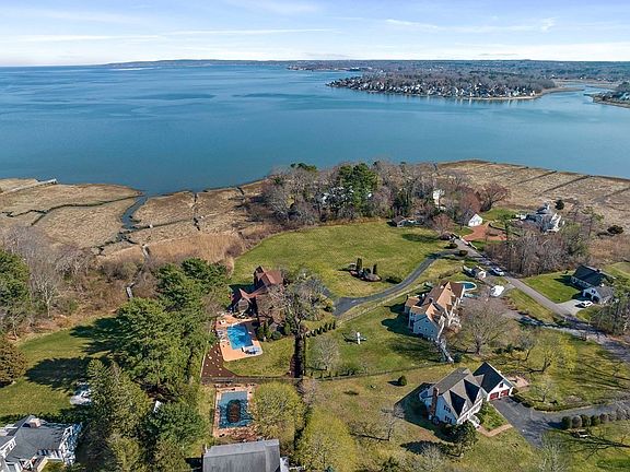 SUNDAY OPEN HOUSE CANCELLED!! This exceptional estate redefines what it means to escape it all and enjoy luxurious coastal living! Sweeping bay & ocean views, impressive design & a tranquil setting are hallmarks of this home. Expansive 2.3 acre lot featuring bay access to enjoy boating & fishing, heated in-ground pool, massive deck & sprawling front lawn - a perfect venue for any event, from clambakes to weddings! Inside you'll discover an open floor plan with the gourmet kitchen at the heart of the home offering effortless entertaining & high end appliances including a built in steamer, Miele espresso machine & double sided fireplace. Other lavish features include teak barrel vaulted ceilings, stone fireplace in family room, full bar with wall of windows capturing breathtaking views. Main level owners suite w/ 3 closets including cedar & ultra spacious bath. Rare opportunity to own an extraordinary property!