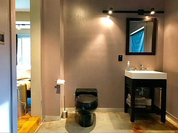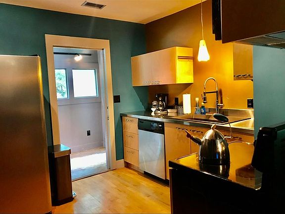 This newly renovated 900 square foot 2 bedroom, 2 bath house has a modern style. The kitchen has stainless steel countertops and an industrial gooseneck faucet. The appliances include a side-by-side black refrigerator with ice & water on the door and a black range with built-in microwave above it. All of the fixtures, paint colors and materials are of a contemporary design. The bathroom is also updated with a modern motif, an Ikea styled sink and vanity accented with track lighting and a Kohler low-boy toilet. The floors are refinished maple hardwoods with the exception of the office and the laundry room, which are concrete. The house comes equipped with a stackable washer and dryer.