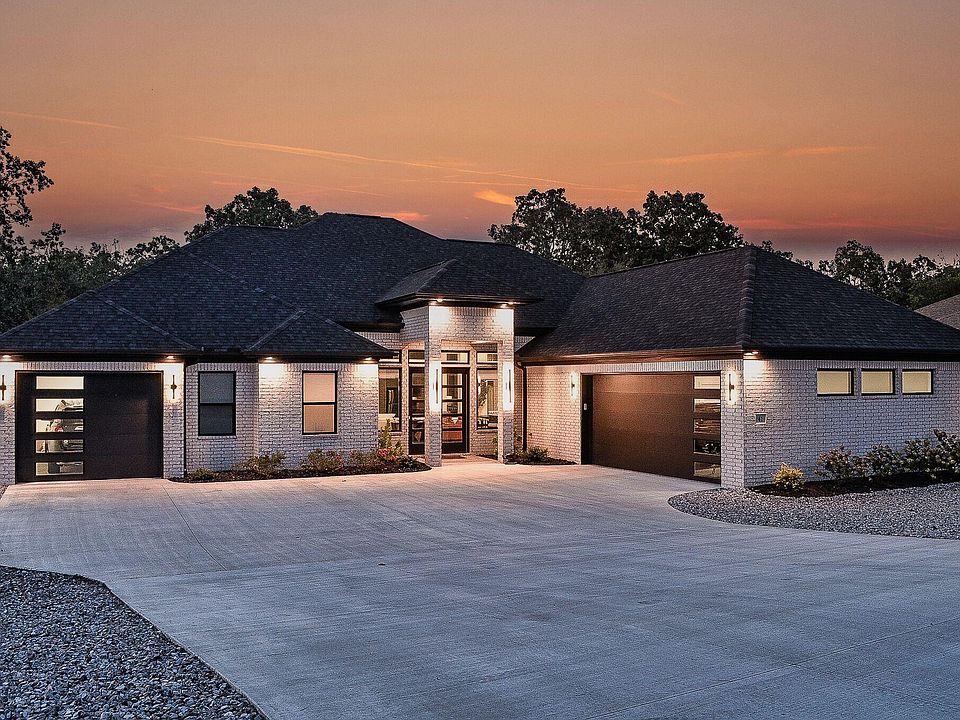 Extra-wide drivewayHalf bathQuartzite backsplashQuartzite wrapped vent hoodPrimary bedroomLarge laundry roomWindowed garage doors