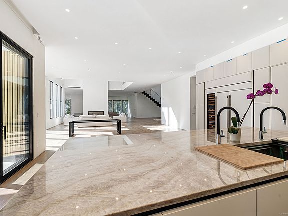 Set on 4 acres of gated, private, west-facing land in the heart of Backcountry Greenwich, this 10,000+ sq ft modern masterpiece is a triumph of minimalist design and exceptional craftsmanship. Conceived by a bespoke local builder in collaboration with renowned Vakota Architecture, the 6 bedroom, 9.1 bath residence blends timeless architecture with the finest European design elements. A grand entrance with soaring 40+ foot ceilings and a floating architectural steel staircase sets the tone for what lies within. Expansive 10' French oak floors and natural Italian lime plaster walls create a serene, organic palette, while oversized windows frame the surrounding natural beauty-blurring the line between indoors and out. The custom Italian kitchen by Bellavista Collection features Taj Mahal countertops, an 11+ foot island, and a hidden scullery/pantry, offering both elegance and function. Flowing, open-concept living spaces are anchored by walls of glass that bathe the home in natural light and lead out to a resort-like backyard with pool and multiple entertaining areas. The luxurious primary suite offers a private terrace with sunset views, a spa-inspired bath, fireplace, and custom walk-in closets. With 11+ foot ceilings on the first floor, 10' ceilings upstairs, and linear diffusers integrated throughout, every detail has been considered to achieve a flawless balance of sophistication and comfort. Accessed via a private bridge, this gated estate delivers unmatched serenity, privacy, and architectural presence. For entertainment and comfort the property also includes a pool, spa, outdoor kitchen, pool house, fully equipped gym, home theater, safe room and a three-car garage with 14-foot ceilings, ideal for accommodating a car lift or additional storage. 1st & 2nd Level: 7838 SF 3rd Level: 990SF LL: 1250 SF TOTAL: 10078 SF PLE HS: 404 SF Q4 completion