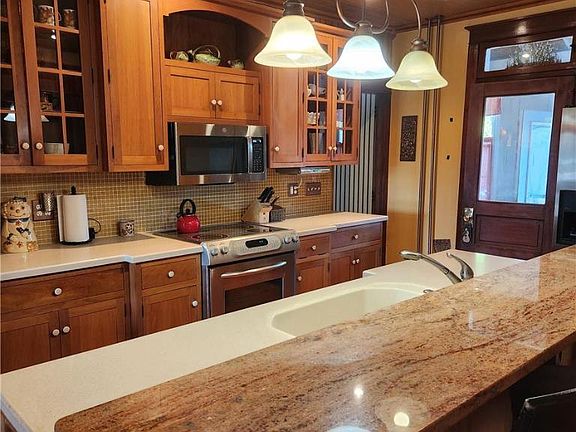Amazing detail paid to Country Kitchen restoration and Design. First floor master suite with soaking/Jacuzzi tub, separate oversized shower, beautiful custom tile work all upscale fixtures, recessed lighting, exposed brick walls. Double swinging French doors, original woodwork throughout, gleaming hardwood floors. Expensive second floor family room-office, potential fourth bedroom suite. 2nd full bath boasts white ceramic tile &upscale fixtures. Bright natural light throughout. new gas heat,Central AC, ceiling fans throughout. Replacement windows. Two garages! a HUGE two- story detached garage with 10 ft ceilings & 8 ft tall doors, 100 amp elec & separate water line..