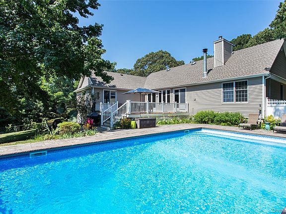 Down a long private drive this post modern expanded ranch w/open floor plan is nestled on 1.3 Acres in REEVE's PARK beach community w/deeded beach rights. This custom built 3 bedroom, 2 bath ranch featuring kitchen complete with induction cooktop, wood cabinets, granite breakfast counter, formal dining room, open living room w/fireplace, and laundry room is just waiting for its New Owners! Enjoy the expansive backyard with ample outdoor entertaining space. Host all of your guests on the large rear deck, overlooking the 18' x 36' heated in ground pool. New Roof w/2 solar attic fans, attached 2 car garage, irrigation, duel 275 gallon oil tanks, oversized cesspool, huge attic w/permanent stairs, full high/dry basement w/OSE, possible mother/daughter. An offering such as this doesn't come up often...Truly a must see!