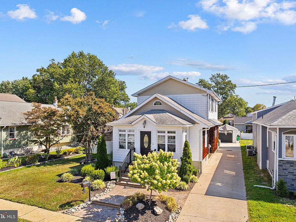 Step inside this lovely bright and cheerful expanded Audubon bungalow and you’ll find a home that combines charm with plenty of space. The enclosed front porch sets the tone for a welcoming interior, leading into a bright living room with warm hardwood floors and timeless details. Just beyond is the updated kitchen, designed with both style and function in mind. A large center island, stainless steel appliances, and rich cabinetry make it the perfect place to gather, while the adjoining dining area feels open and connected. A bonus area at the rear of the home, with sliders to the deck and backyard, offers the perfect spot for a home office, hobby space, or reading nook. The first floor also features a spacious primary bedroom, a second bedroom, and a beautifully updated full bathroom with a double vanity. Upstairs, three generous bedrooms provide flexibility, and one includes access to a charming hidden bonus room that can be used as a play space, creative studio, or extra storage. Another full bath completes the second floor. The full basement, with its own exterior entrance lends for the perfect mudroom leading up to the Kitchen and offers even more potential for storage, workshop and generous area dedicated for Laundry. Outside, you’ll love the fenced backyard with its deck, patio, and play area—ideal for relaxing or entertaining. A detached oversized one-car garage and attractive stamped concrete walkway add to the curb appeal. Notable upgrades include dual zone heating and cooling, a brand-new roof, and a new skylight upstairs. All of this is tucked into a desirable neighborhood within walking distance to downtown, where shops, dining, and community events are close at hand and just a short walk to Schools and Playgrounds. This home is move-in ready, with the space and flexibility to fit your needs both now and in the future.