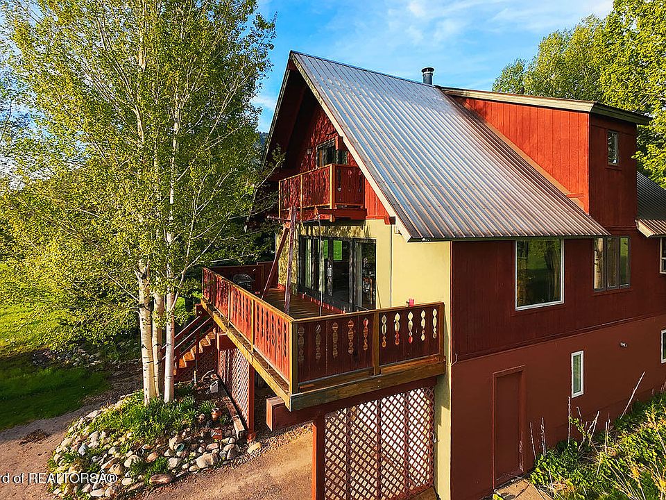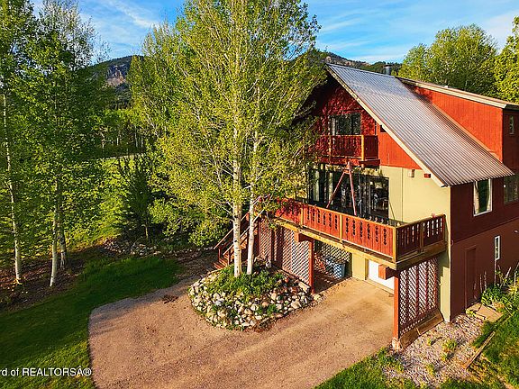 Mountain Chalet nestled in the serene surroundings of Star Valley Ranch, WY. This enchanting home is a perfect blend of modern comfort and rustic elegance, ideal for those who cherish tranquil living amid nature. Step inside this meticulously cared-for cabin, spread across three levels, offering spacious and versatile living spaces. The home features three bedrooms and 2 bathrooms, with the top bedroom boasting a private balcony that overlooks breathtaking mountain views, creating a personal retreat. The allure of this property extends beyond the interiors. Step outside to find multiple outdoor seating areas, including a delightful fire pit area, perfect for gatherings or peaceful evenings under the stars. The home's distinctive gingerbread railings adorn all three decks, adding a unique and charming touch. Large windows throughout the home capture panoramic views of the surrounding mountain ranges, seamlessly blending outdoor beauty with indoor comfort. The living room is a true highlight, featuring gigantic sliding glass doors that bring outdoor living indoors, making it an ideal space for relaxation and entertainment. For gardening enthusiasts, enjoy two separate gardening areas ready to cultivate your green thumb. This home offers a harmonious blend of lifestyle and location, perfect for those seeking a retreat in the heart of nature.