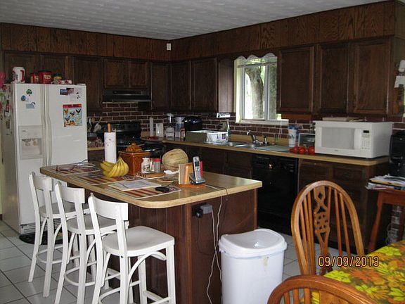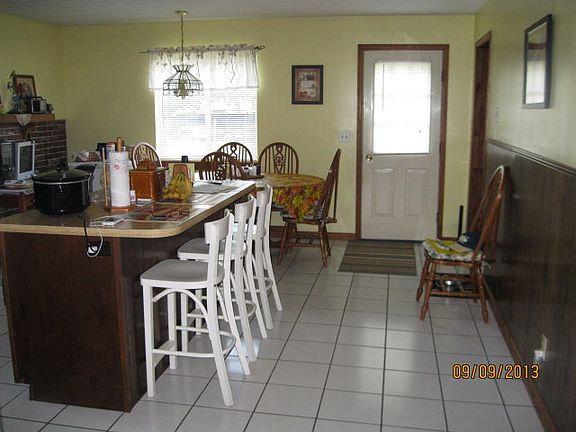 Lovely all brick ranch situated on 3.5 acres of level land, country setting, convenient location. 2 lg bedrooms, 1 bath. Spacious living room features wb stove, eat-in kitchen w/island & tile floor. New bathroom. New hot water heater (2012), newer heat pump. 1 car det. garage w/new door. Huge barn/outbldg. offers mega storage. Front porch shaded by mature trees & large side porch by kitchen.