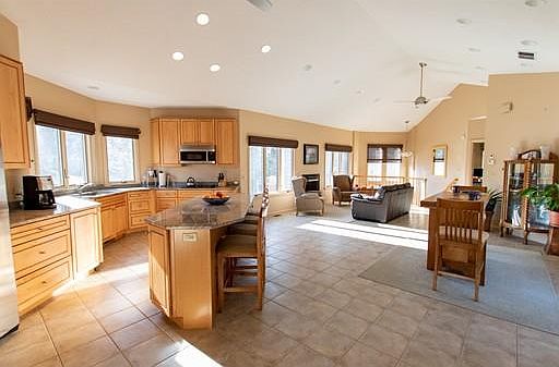 - Kit Dscrp: Main Level, Dining Area, Ceiling Fan(s), Countertops - Stone/Granite/Solid, Flooring - Stone/Ceramic Tile, Kitchen Island, Stainless Steel Appliances, Open Floor Plan, Recessed Lighting, Exterior Access