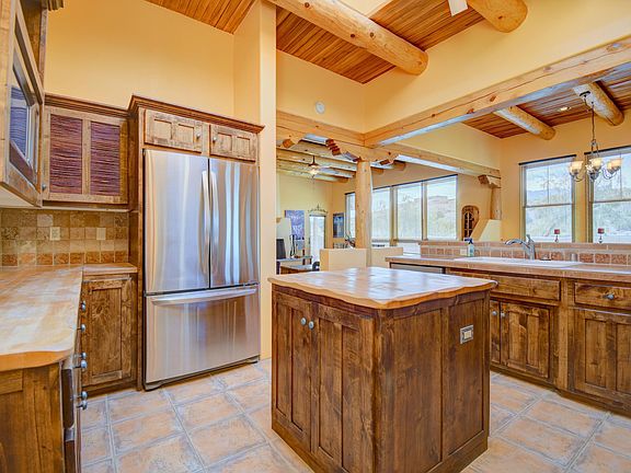 Panoramic Sandia Mountain and city skyline views welcome you home to this custom single story in Placitas on 1.4 acres. Enjoy classic southwest style including Saltillo tile floors, vigas, beamed cedar ceilings and 2 fireplaces. Skylights and large windows bring in natural light throughout. The spacious primary bedroom features a kiva fireplace, patio door, beamed ceiling and walk in closet. Relax in the spa-like ensuite bath with jetted tub and tiled corner shower. The outdoor experience provides serenity and privacy with 3 large covered patios and pristine natural landscaping. The property backs to BLM land, creating a buffer from further development. Recent updates include new stucco, window blinds, landscaping and garage finish.