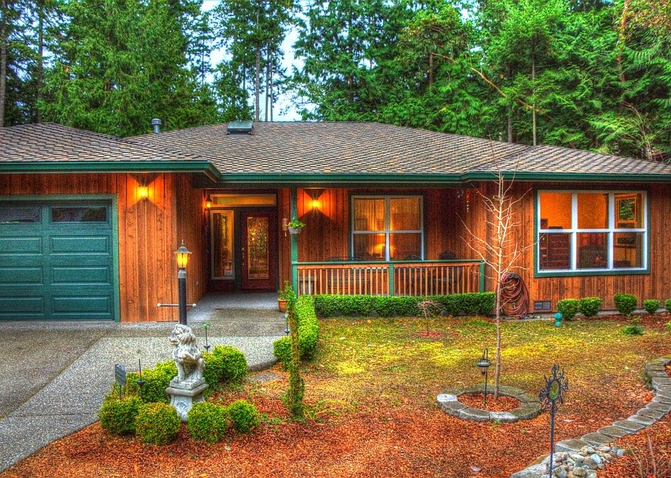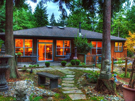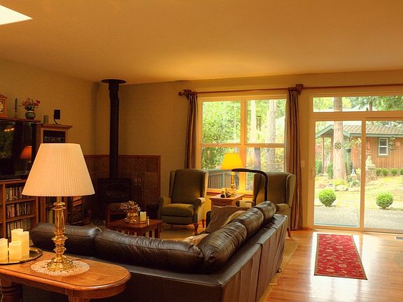 Northwest style wood sided single level home on large lot with perfect open floor plan and ADA accessible. Finishes are just what you want; granite counters,tile and hardwood floors. Chefs kitchen with dual fuel range, large pantry, and built in china cabinet. And then there are the grounds w/walkways, outdoor "rooms", a garden shed and carefully chosen plants and trees, all translating into a very serene and well planned setting. Fencing for a pet if you wish. 50 year roof & 3 bedroom septic.