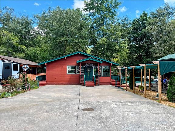 You'll LOVE relaxing here seeing the amazing rare, serene Creek side views and hearing the soothing sounds sitting on the oversized screen porch! The back screen porch is exceptional and is like having another whole cabin since it has a dining area where you can enjoy special meals, and a buffet for your delicious spread of goodies, a spacious living area where you can relax on the rocker glider loveseat, rocker glider chair and more comfy chairs with your family or guest and cozy up and warm your feet on the stone-top fire pit! The versatile, large concrete parking pad has full hookups for an RV on both sides! Let's back up now and come enter the front of this rustic cabin through an upgraded beautiful, quality beveled glass door with pull screen and see the panoramic views in an open plan with pine wood walls, insulated vaulted pine ceiling, tile floors, and 2-inch wood look blinds surrounded by real "Glass" Windows! It has one of the nicest kitchens here in Paradise with this chef dream center island bar to enjoy meals prepared with GE cooktop/griddle, microwave, plus an upgraded farm sink, KitchenAid Refrigerator, and is plumbed for a dishwasher! Outside you'll find a full-size oven/range to cook and keep the inside cooler! The family area has a futon sofa to relax or sleep, His and Hers love seat style recliners. There is a full bath with shower and a cedar-lined closet. An exterior entry storage room is just off the deck as well. Not only is it being sold fully furnished, but all the cute cabin decor stays too, so just bring your clothes, food, and don't delay! Get ready to truly relax here because there is NO grass to cut... HOA takes care of grass on this section of the creek! Located in the very desirable and well-kept Paradise Valley Campground. You'll create a lifetime of memories here, whether you're relaxing, fishing, or participating in the ongoing activities in Paradise, a gated community nestled in the North Georgia Mountains with fantastic amenities! Enjoy the pool, pavilion, clubhouse, and planned activities. The location is central to all the fun mountain towns and events, just minutes from Cleveland, Helen, Dahlonega, Clarkesville, and Blairsville. Shop, dine, fish, hike, and visit vineyards; the possibilities are endless! Please note, Paradise is a vacation resort community that does not allow full-time living. The listing agents are both owners in Paradise, so feel free to call for a tour or more detailed information about Paradise and this property.