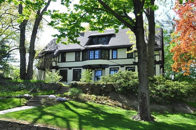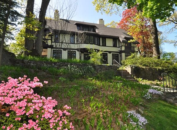 This majestic five-bedroom Tudor Revival circa 1910 home is set impressively on .60- acre of park-like grounds located in the premiere Lawrence Park West area of Bronxville P.O. It is not surprising that the artist Hobart Nichols choose this spectacular lot to build this wonderful home. Forty-One Sunnybrook Road is 4,000-square foot home showcasing beautiful architectural details including beautiful wood-beamed coffered ceilings, leaded windows, two-wood burning fireplaces as well as a decorative wood burning-hearth, wood paneled walls and built-in cabinetry in the formal dining room, stained-glass door overlooking the garden, and two Juliet balconies. The main level of this exceptional home provides a large entrance area, formal parlor with wood-burning fireplace and sliding glass doors to the expansive patio, a sunken family room/studio with decorative windows, French doors to the patio and wood-burning hearth, formal dining room, breakfast room, dine-in kitchen, powder and bonus room. The second level of this home has a large master bedroom with Juliet balcony, four bedrooms and two full bathrooms. The third level provides bonus space and storage. There is no doubt that this wonderful home is perfect for living, playing and welcoming new memories.