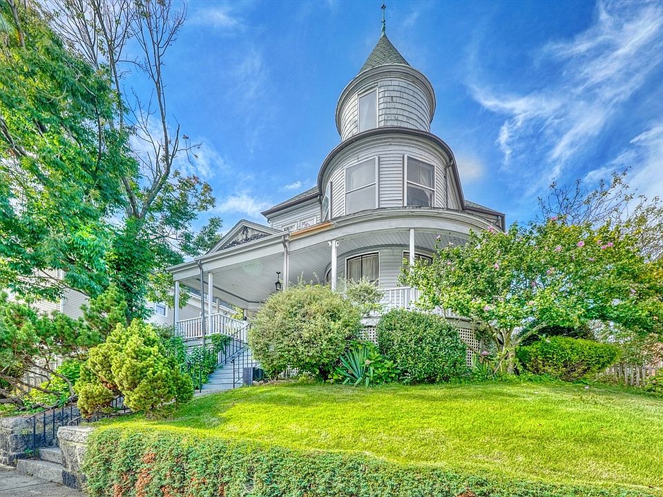 Soaring ceilings and exquisite period details define this gracious Victorian residence, where ocean breezes drift through expansive windows. Original hardwood floors flow throughout, complemented by ornate woodwork, vintage stained-glass windows, elegant pocket doors, and a stunning tiled fireplace. The chef's kitchen stands ready to inspire culinary creativity with its commercial-grade range and refined aesthetics. A front porch provides the perfect vantage point to catch refreshing sea breezes and savor quiet moments. The property's thoughtfully sized yard offers the perfect balance of outdoor enjoyment without demanding extensive upkeep, ideal for those who prefer spending time at nearby beaches rather than tending to landscaping. Need even more space? The walk-up attic is just waiting to be finished, complete with water views. This residence artfully preserves its historic character while providing modern comfort, where every room tells a story of craftsmanship and coastal charm.