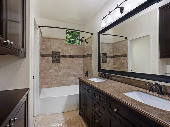 Upstairs, the primary suite offers a spa-inspired bathroom with dual vanities, granite counters, a travertine tub/shower with designer accents, and upgraded lighting and mirrors. Two additional bedrooms provide flexibility for family, guests, or a home office.