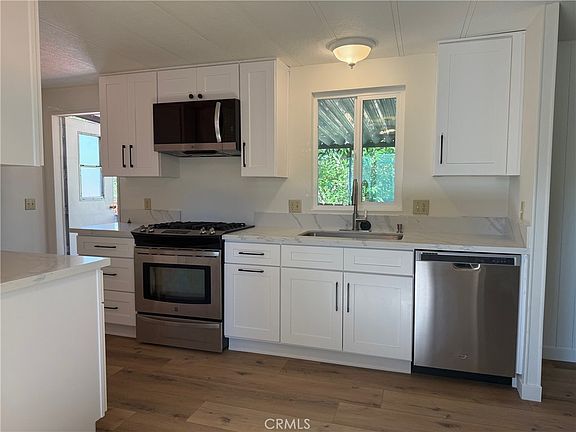 Welcome to this beautifully updated 2 bedroom, 2 bath, 840 sq ft mobile home, offering modern touches and comfortable living, situated in Rancho Paso 55+ community. Freshly painted inside and out, the home features vinyl plank flooring throughout and a bright, airy living room. The kitchen shines with all-new white shaker style soft-close cabinetry, sleek quartz countertops, stainless steel appliances, and a charming window over the sink. The primary suite boasts an en suite bathroom with matching shaker cabinetry, quartz counters, and a spacious shower. The guest bathroom has been thoughtfully updated to complement the home’s cohesive design and has a new tub and shower tile. This home is conveniently located near shopping, dining, the 101 freeway, and offers access to the community pool and more!