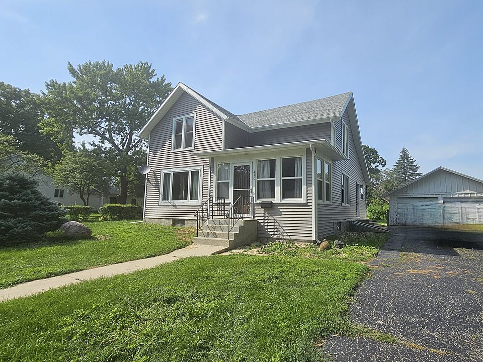 Charming and versatile, this spacious 3-bedroom, 2-bathroom home offers a unique blend of functionality and comfort. Previously utilized as a multi-unit property, this home boasts two fully equipped kitchens, perfect for extended family living or potential rental opportunities. The home has an interior staircase as well as an exterior stair case leading to the second floor. The home features a dining room and one living room adorned with elegant hardwood floors, adding warmth and character to the space. A second living room provides additional space for relaxation or entertainment. Outside, enjoy a 10x10 deck in the spacious backyard, ideal for outdoor gatherings, and a convenient 2-car garage for ample parking and storage. With its flexible layout and desirable features, this property is a rare find in. Exterior is Maintenance free with Vinyl Siding, Vinyl Windows, Fascia and Soffits. Come take a look today!