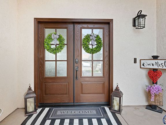 Welcome home! This beautifully maintained property reflects true pride of ownership, both inside and out. From the moment you arrive, you'll be impressed by the exceptional curb appeal, featuring lush green turf and vibrant, colorful landscaping. As you approach the house, a stunning custom front door sets the stage for what awaits inside. Step through the entryway and into a beautifully decorated interior showcasing lovely flooring, a custom-built entertainment center, and warm, inviting colors that create a comfortable and stylish living space. This home features an open living and dining area combination with french doors leading to the backyard patio, perfect for indoor-outdoor living. The spacious family room showcases a custom entertainment center that serves as a striking focal point. The kitchen is beautifully appointed with an attractive backsplash, granite tile countertops, stainless steel appliances, and a versatile center island ideal for prep, dining, or gathering.Located on the west side of the home are four bedrooms and two bathrooms. The generously sized primary bedroom includes a walk-in closet, with a sliding glass door leading to the back patio, and an en-suite bathroom with dual sinks. The updated hall bathroom has been remodeled in spectacular fashion and conveniently serves the remaining three bedrooms. The backyard showcases lovely landscaping and a covered patio ideal for relaxing or entertaining outdoors. Removable gates in place for pets, crushed granite base on the west side of the backyard, and cement walkway on the east. A good sized two-car garage includes extensive shelving for all your storage needs. This property is definitely one for your viewing list. Make your viewing appointment today!
