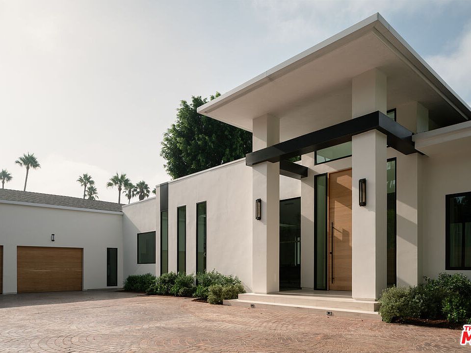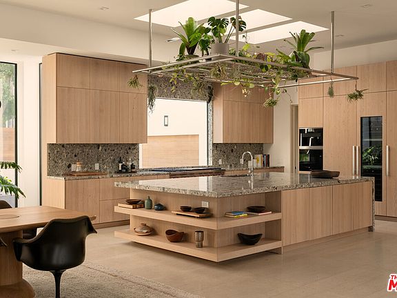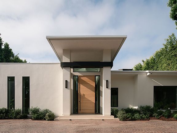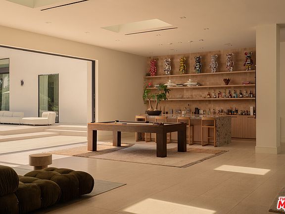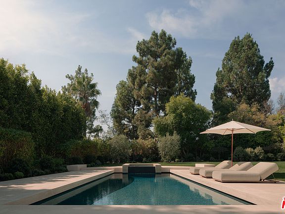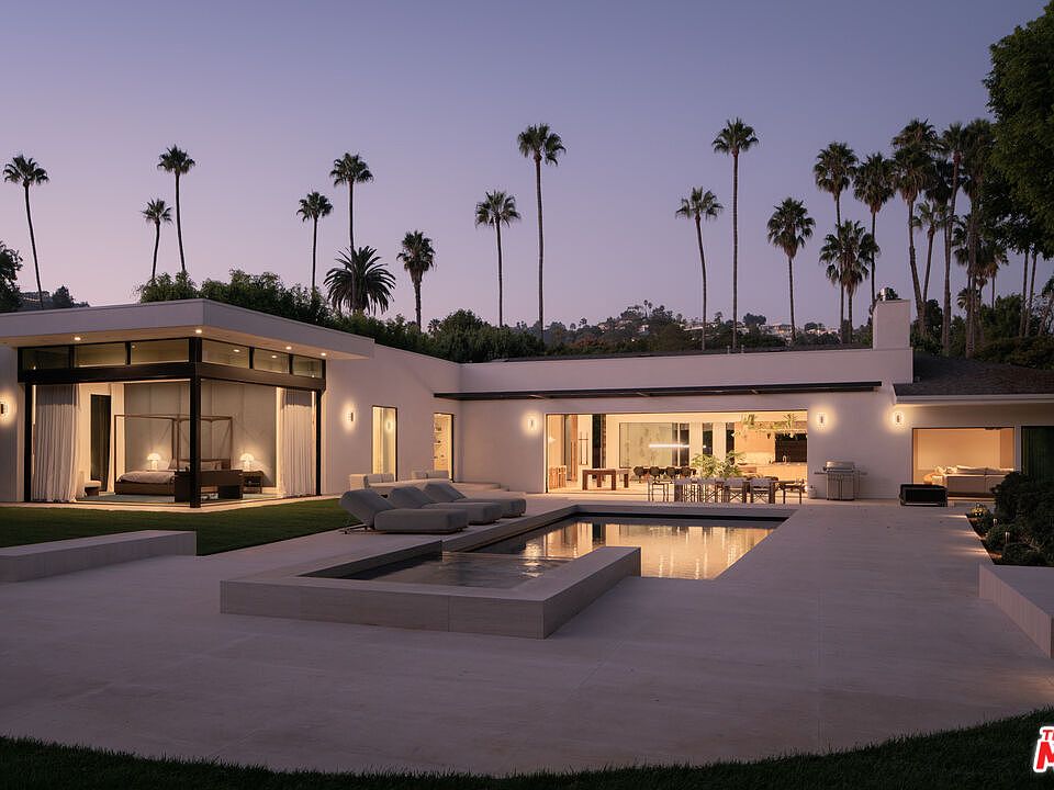 Located in the most prime section of Beverly Hills behind private gates on over half an acre of flat, fully usable land, this single-story contemporary residence blends architectural character with warm, livable design. Soaring 12-foot ceilings and skylights throughout create an open, sunlit flow from the kitchen to the family room, anchored by a wet bar and floor-to-ceiling pocket doors that open seamlessly to the grounds. The home's four bedrooms include a dramatic primary suite with retractable glass walls overlooking the pool and lush landscaping cultivating an effortless indoor-outdoor connection that defines the California lifestyle. The pool and spa serve as the centerpiece of the outdoor living space, offering a tranquil backdrop for daytime lounging and evening gatherings. Designed for both everyday living and entertaining, the home features a professional movie theater with stadium seating, a custom bar, and multiple outdoor gathering areas framed by mature trees for total privacy. Additional highlights include a 3-car garage, ample guest parking, and an exterior carport for security. At twilight, the property glows with its modern lines and layered landscape lighting creating a resort-like ambiance in the heart of Beverly Hills.