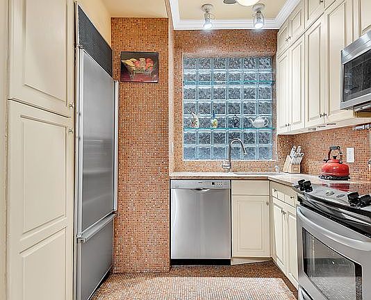 Never wait for the elevator again, just enter through the elegant marble lobby right into your fabulous new home! With great scale and flow, this one bedroom, two bath home is ideal for gracious living and entertaining. Prewar features include high beamed ceilings, beautiful herringbone oak floors and a fabulous decorative fireplace. The peaceful bedroom has great storage space (including built-in storage and desk area) and easily accommodates a king sized bed and oversized furniture. The opulent en suite bath features luxury Sherle Wagner fixtures, an oversized spa tub and marble galore. The second bathroom is similarly fitted and includes a corner shower for those pesky overnight guests. The separate kitchen has tons of cabinet space, stainless appliances, stone countertops and a glass block window and mosaic tile floors and backsplash provide a whimsical midcentury modern touch. The large foyer with abundant built-in storage serves as an ideal dining space. Central air, too! On top of that, you will enjoy easy access to the building's common garden down the hall, which is nicely landscaped and furnished with lounges and BBQs for your relaxation.