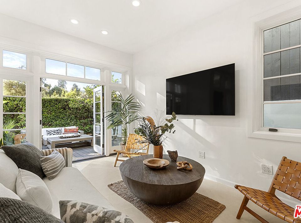 Nestled in the coveted Santa Monica Canyon, 410 Entrada Dr offers a serene private retreat moments from sandy beaches, hiking trails, and world-class dining. This light-filled home combines character and modern comforts, featuring vaulted ceilings, exposed beams, hardwood floors, and custom Spanish tile details. The main level includes a spacious living room with French doors leading to a lush front patio, a remodeled kitchen with high-end appliances, and an elegant primary suite with a fireplace, walk-in closet, and spa-inspired bath. Two additional bedrooms, one opening to the terraced backyard, provide flexible living options. The outdoor spaces include a private garden with dining and lounging areas, a hot tub, and a tranquil canyon view. Additional features include air conditioning, a secure two-car garage, and ample driveway parking. This is a rare opportunity to own a home in one of Los Angeles' most sought-after neighborhoods.