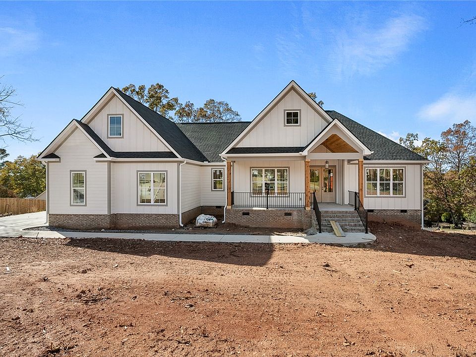 Come and see 410 Holly Ridge's newest abode, the newest home on this established road! Tucked into the sought-after Holly Creek subdivision, an established neighborhood inside Anderson city limits with affordable utilities and access to all major shopping, restaurants, medical, fitness and more! From the moment you arrive, the stunning exterior and covered, tongue and groove planked front porch set an inviting tone. This floor plan supports an easy, elevated lifestyle. Cathedral ceilings, a custom accented gas-log fireplace, and quartz countertops create a warm but refined main-living environment. The kitchen’s flow to both the living room and the casual dining room make everything from weeknight dinners to holiday hosting feel simpler. The main-level primary suite offers a quiet retreat with a walk-in shower, separate soaking tub, double sinks, and large walk-in closet—all designed for comfort and convenience. There's also a finished room on the second level to use a variety of ways! Sitting on nearly half an acre with a gentle slope and trees, the backyard gives you space to relax and breathe. The rear deck is covered and expands your living area outdoors—perfect for morning coffee, grilling out, or unwinding after a long day. The rarely found three-car attached garage creates room for vehicles, storage, or hobbies without sacrificing your interior space. Whether you’re downsizing to single-level living, seeking a well-appointed new construction home close to town, or simply wanting a peaceful, no-HOA community where quality and comfort come first, 410 Holly Ridge offers a lifestyle that feels both grounded and elevated—move-in ready from day one.