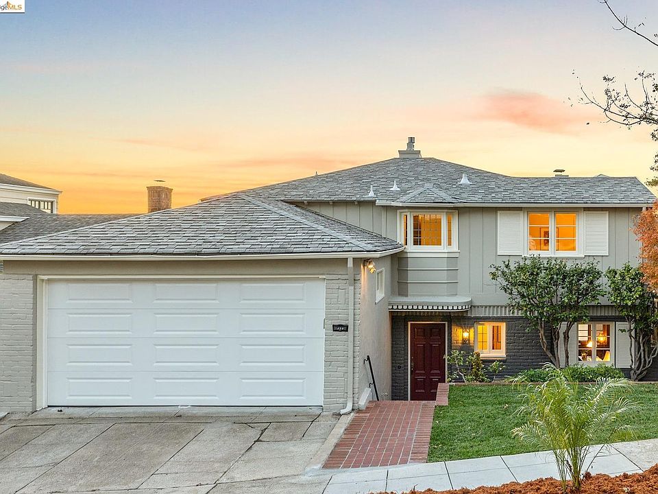 Opportunity knocks! Beautiful 1930s classic with lovely architectural details, gorgeous Bay, Golden Gate, San Francisco, and multi-bridge views, nice light, a well-conceived floorplan, and loads of space. Comfortable and spacious living room with beamed wood ceilings and fireplace, and elegant formal dining room, both taking great advantage of the big views. Eat-in kitchen combines a vintage feel with all new high-end appliances and lush marble countertops. Wood-paneled study, plus an additional flex room for a second office, an art room, or guests. Primary suite captures the incredible, ever-changing views from both the bedroom and the attached balcony. Three generously-sized bedrooms and two full baths (including the primary suite), all on the same level. Large rec room opens to the back garden. Interior access from the 2-car garage, wired for an EV charger. Serene but convenient location, near parks and nature, where you can leave the car at home and head over to nearby shops (for fantastic sushi, a bottle of wine, gourmet sandwiches, groceries, hardware, etc.). For quality of life, real character, breathtaking views, room to spread out, and much more, this is a great one!