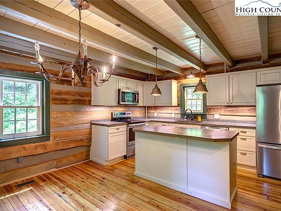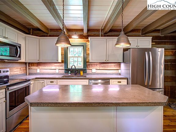 Nestled in the heart of Sugar Grove 410 Loves Knob is a charming log cabin in the woods that offers a perfect mountain getaway for full time living, a second home or rental investment property. This secluded retreat sits on 5 acres of lush greenery with a gentle creek running through it, providing a serene and private setting that is perfect for relaxation. The interior boasts a beautifully updated country kitchen with concrete countertops, new cabinets and pine floors. The multiple stone fireplaces add to the rustic charm of this home, providing an idyllic atmosphere for cozying up during chilly winter nights. The property also features covered patios, offering ample opportunity to enjoy the serene mountain setting all year round. With room for gardening and enjoying the outdoors, perfect for relaxation, this log cabin is the ideal escape from the hustle and bustle of everyday life. Updates include a new HVAC system, Anderson windows, and professionally designed bathrooms with hand painted tile from the UK! Don't miss out on the opportunity to make this stunning log cabin your own piece of paradise in the mountains.