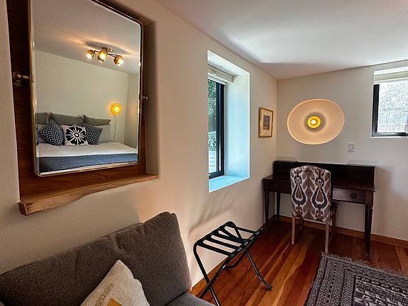 Step into this spacious 1200SF, fully furnished garden-level home where timeless mid-century modern style meets brand-new finishes and decor. For much of the year, the lush tree canopy outside creates a cozy, shaded retreat but when the leaves fall, the home is flooded with bright natural light for seven months straight.
