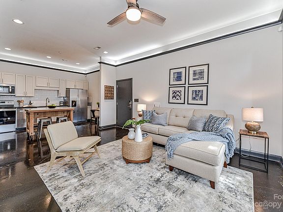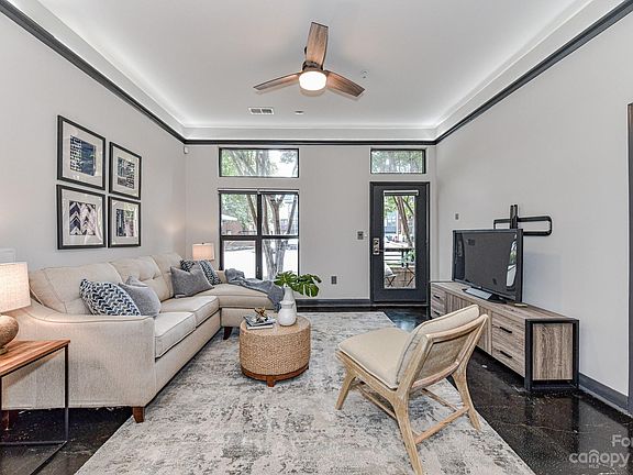 Stunning, main floor unit in white hot South End! FRESHLY PAINTED interior & BRAND NEW STAINLESS APPLIANCES. Gleaming, polished concrete floors throughout. Great, open-floorplan w/ soaring 10ft ceilings. Kitchen features dark, honed granite counters with white cabinets, subway tile backsplash, undermounted sink, SS appliances & large white granite rolling island. Spacious great room. Large Primary Bedroom has tons on natural light w/ renovated ensuite bath featuring granite counters, beautiful tilework and seamless glass shower. Walk in closet with custom built-ins. Lovely covered patio to enjoy fresh air nestled with trees and a grassy area. Remote controlled custom rolling window shades on all windows. Lightrail just a few steps from complex. Urban living at its finest! Prime location close to great shopping & dining in South End & Uptown Charlotte.