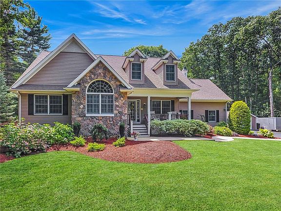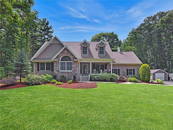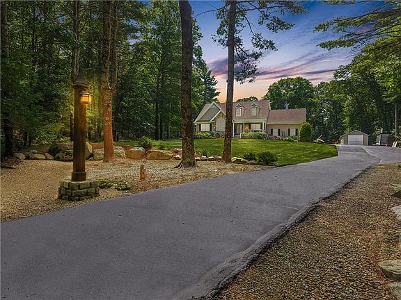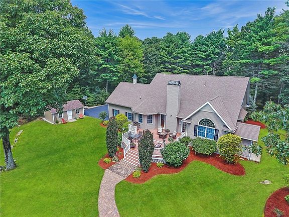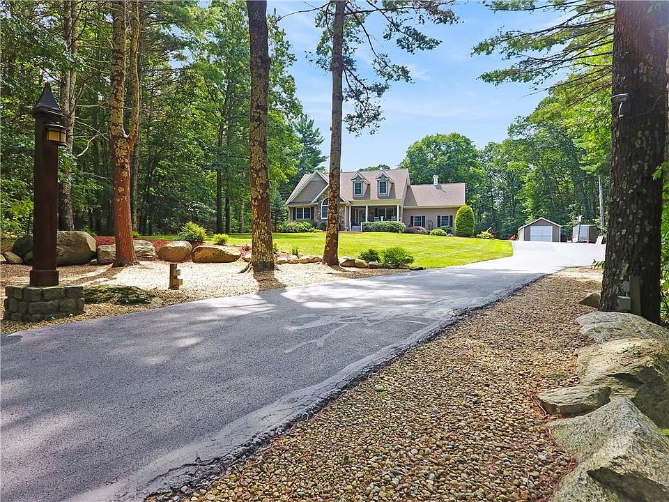 PARADISE FOUND! Welcome home to your private retreat showcasing this captivating Contemporary Cape nestled on 4.8 private acres surrounded by mature trees & new plantings boasting New England charm. The main level features a marvelous chef's kitchen equipped with new stainless appliances, custom cabinetry, granite/tumbled marble, and a separate island breakfast bar opening to the soaring great room lined with Palladian windows leading out to a lovely deck overlooking the resort-like pool area featuring an 18x36 lagoon-shaped heated pool, outdoor "tiki" bar, applianced pool house with bath and an outdoor shower perfect for summer entertaining and family gatherings. Other featured rooms on the main level include a formal dining room, sunlit master bedroom & an ensuite luxury bath with jetted tub and an oversized glass-enclosed spa shower, a home office, guest bedroom, full bath & laundry area complete the first level. The second level features 2 large bedrooms, a full bath, and a sitting area overlooking the main level. A fabulous finished basement is equipped with a professional home gym, huge game room/playroom, large-screen TV area, and lots of storage. A 2-car heated garage is attached to this amazing home as well as an additional single-car detached garage w/heat & electricity. Some amenities include C/A, irrigation, alarm, and much more. This hidden wonder is conveniently located to schools & shopping. Minutes to Rt.12 & 14 with easy access to Rt. 95 & 295. See 3-D Tour