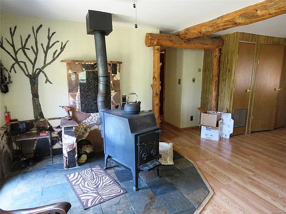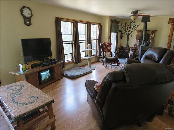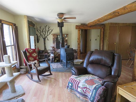 Unique Peak view property on 4+ private wooded acres. One level living in spacious, sunny home with custom tile and finishes. Separate garage/workshop with lots of level parking. Close to Divide and paved roads. Walk to school bus stop on County Road 51.